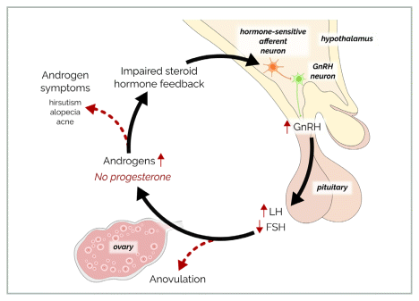 Rapid GnRH pulsatility, in turn, promotes further impairment of the hypothalamic-pituitary-ovarian (HPO) axis by suppressing follicle-stimulating hormone (FSH) and stimulating LH resulting in stalled follicle development and high thecal cell androgen production, leading to aromatization and tonically high estrogen levels.24 The resulting ovulatory disturbance and progesterone deficiency further deprive the system of the progesterone feedback that normally slows GnRH pulsatility, creating a vicious cycle,24 as illustrated in Figure 1.