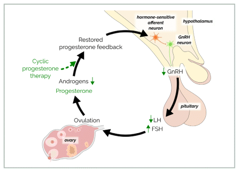 FIGURE 2 Treatment of androgenic polycystic ovary syndrome with cyclic oral micronized progesterone therapy. Oral micronized progesterone (OMP) given in a cyclic pattern for 14 days to mimic the luteal phase acts centrally to restore the healthy function of the GnRH pulse generator, suppress LH, and reduce androgen excess, promoting ovulation.