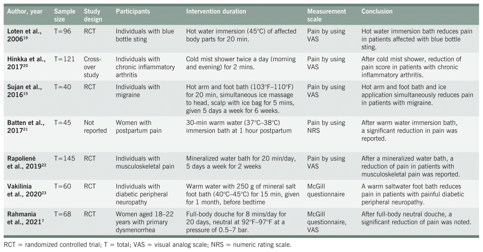 A total of seven studies, conducted in Newcastle, Lithuania, Finland, India, and Iran, were included in this review.7,15,19–23 A total of 592 participants were enrolled in the study who were suffering from different sorts of pain: blue bottle sting, chronic inflammatory arthritis, migraine, postpartum pain, musculoskeletal pain, diabetic peripheral neuropathy, and primary dysmenorrhea. Among the included studies there were five randomized controlled trials (RCTs)7,15,19,22,23 and one cross-over study.20 No details about the study design were given for the seventh study. All the studies used hydrotherapy as their intervention, with a minimum duration of two minutes and up to one hour. For assessment, four studies used a visual analog scale (VAS),15,19,20,22 one study used a McGill questionnaire,23 one study used a McGill questionnaire and VAS,7 and one study used a numerical rating scale (NRS). 21