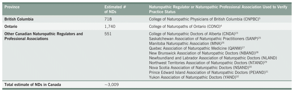 TABLE 1 Naturopathic regulator or naturopathic professional association used to verify practice status and the estimate of number of NDs by province9