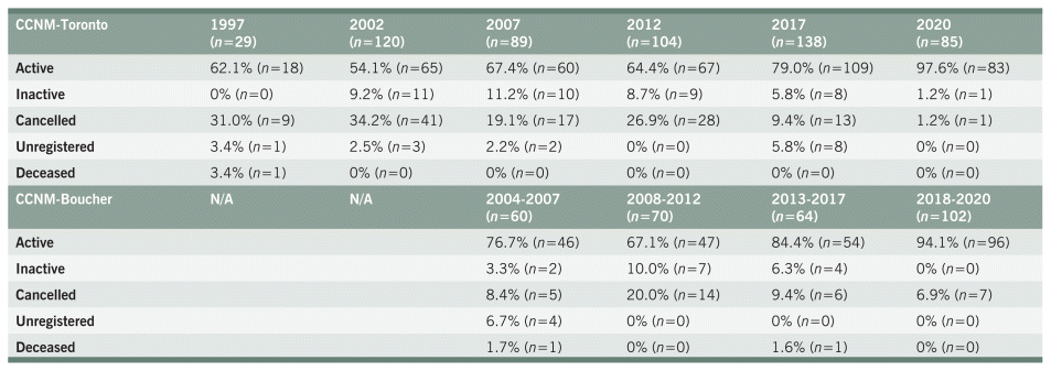 Since the inception of CCNM-Toronto in 1978, there have been over 3,600 graduates.1,9 For the purpose of this study 6 graduating cohorts (1997, 2002, 2007, 2012, 2017, 2020) from CCNM-Toronto were selected. Due to the large number of graduates, the selection of the CCNM-Toronto cohorts was based on 5-year intervals limited to the last 25 years of graduates. The cohort selection was made a priori, purposely by the primary author and approved through discussion and consensus of all authors to minimize cohort effects that could not be overcome with study design or statistical analyses such as small sample sizes or confounding variables.12 As such, we avoided graduating years with significant confounding external factors that might have affected the results, including: periods of substantive changes in enrollment (1999), or disruption to the educational institutions (e.g., the move of the CCNM educational institution to its current location in August of 1999 and the accreditation of the CCNM naturopathic medical educational program in 2000 by CNME).1 None of these potential confounding factors were experienced by the CCNM-Boucher cohorts. The last cohort was chosen as 2020 versus 2022 to ensure sufficient time after graduation to allow for accrual of registration and registration status outcomes, hence minimizing the influence of time-based opportunity on our findings. Based on the significant difference in class size between CCNM-Toronto and CCNM-Boucher, and the desire of the authors to have a sizable, comparable number of graduates from each educational institution, all CCNM-Boucher cohorts were included (from 2004 until 2020). The cohorts from CCNM-Boucher were grouped to allow for comparison with the cohorts from CCNM-Toronto. A listing of graduates prior to 2008 was contained in the book The History of Naturopathic Medicine, a Canadian perspective.1 The listing of graduates from 2009 to 2020 was verified by CCNM-Toronto and CCNM-Boucher personnel.9
