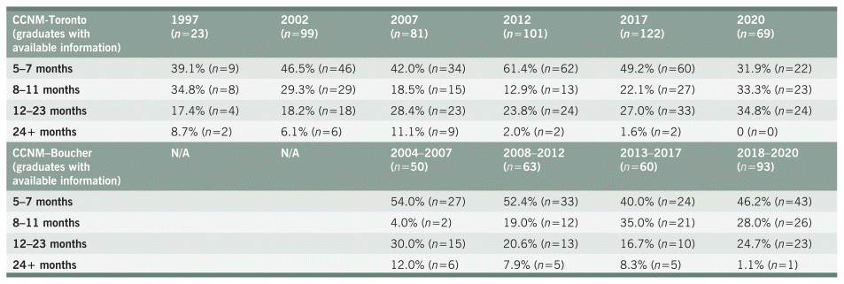 As outlined in Table 2, 47.1% (n=233) of graduates from CCNM-Toronto acquired registration within 7 months of graduation, 23.2% took between 8 and 11 months and 25.5% took 12 to 23 months, with 4.2% taking more than 2 years following graduation to acquire registration. Of the CCNM-Boucher graduates, 47.7% acquired registration within 7 months of graduation, 22.9% within 8 to 11 months, 22.9% within 12 to 23 months, and 6.4% took 24 months or longer. As outlined in Table 4, in 2012, 61.4% of CCNM-Toronto graduates acquired registration within 7 months compared with only 31.9% in 2020. The percentage of CCNM-Boucher graduates acquiring registration within 7 months has remained fairly consistent over the cohorts ranging from 40.0% to 54.0%.