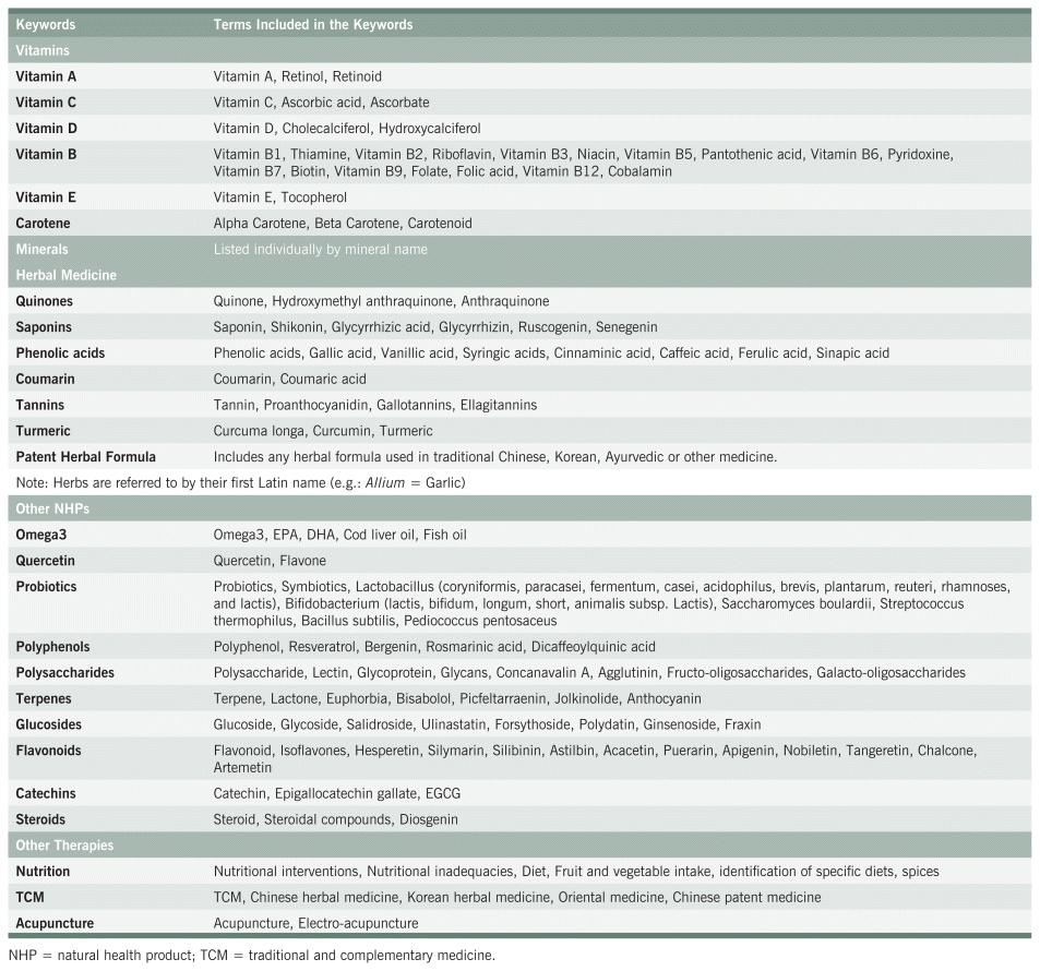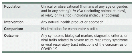 PubMed and Google Scholar databases were used, with search terms such as “natur*,” “herb*,” “nutraceutical,” “botanical,” “medicinal plant,” “Ayurvedic,” “Chinese medicine,” “herbal patent formula,” “vitamin,” “mineral,” combined with “prevention,” “prophylaxis,” “deficiency,” “treatment,” “management,” and “*COVID*,” “Coronavirus,” “SARS-CoV-2.” Additionally, individual herb names, compounds, vitamins, and minerals cited in the literature were searched. Though this report has drawn a line in the sand in December 2022 to publish the results thus far, monthly updates on published systematic reviews on the topic will continue.