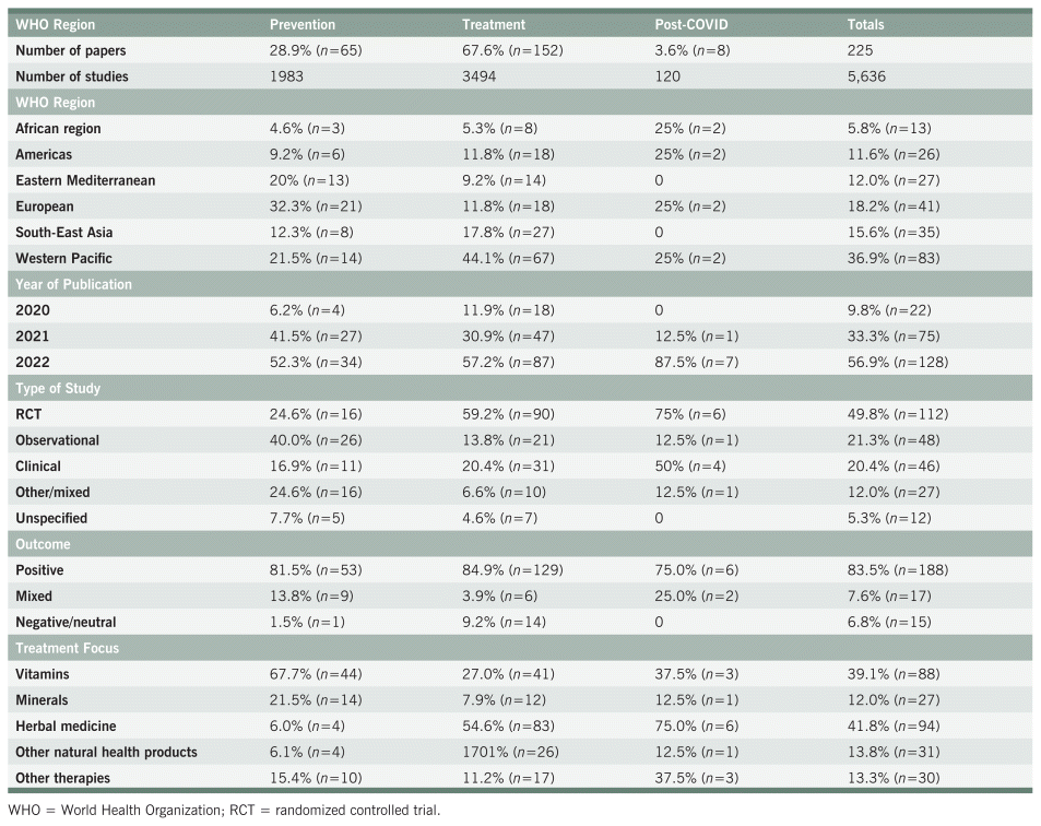 Between May and December 2022, a total of 225 systematic reviews focused on the role of NHPs or natural therapies with respect to the prevention and/or treatment of COVID-19, or post-COVID systems.6–211 Of those, 28.9% focused on prevention, 67.6% on treatment, and 3.6% on post-COVID. In sum, 5,636 studies were reported as part of the systematic reviews, involving over 4 million participants and a reference list of 8,870 citations. With regard to the publication dates, 9.8% of the papers were published in 2020, 33.3% in 2021, and 56.9% in 2022.