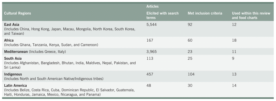 This realist synthesis highlights the components of the MD by isolating variables with purported health benefits and searching for scientific evidence showing where those variables can be found within other cultural affinities. Foods and constituents were analyzed to assess benefits for both healthy and metabolic disease states. Databases used include PubMed, Cochrane, and PMC, from inception to May 1, 2022. To account for major demographic groups, cultural diet paradigms are divided into six major groups outlined by the OldWays cultural affinity diet database.11 Search terms include “traditional diet” in combination with the cultural groups and possible health markers such as BMI OR weight OR “waist circumference” OR cholesterol OR LDL OR HDL, as outlined below in Table 1. Different combinations of dietary components and regions as search terms were included to gather as many studies as possible to ensure that each cultural dietary paradigm was thoroughly researched. Health outcomes for people consuming their respective cultural diet paradigm were then compared with the SAD. Health outcomes used for comparing dietary paradigms include diabetes, heart disease, cardiovascular health, metabolic syndrome/disease, and weight maintenance. Metabolic disease state outcome measures may include hemoglobin A1C (HbA1C), triglycerides (TG), high-density lipoprotein (HDL), low-density lipoprotein (LDL), total cholesterol (TC), waist circumference, overall weight, aspartate aminotransferase (AST), and alanine aminotransferase (ALT). Exclusion criteria for this review include nutritional supplements (i.e., natural health products or dietary supplements) used as therapeutic interventions, diets as clinical trials including dietary changes, and regions outside the six major cultural groups specified by OldWays. Each cultural dietary paradigm chosen for this phase of the research is outlined and defined by its respective traditional foods native to and eaten within the cultural region at present day. Reference tables were created using the cultural food information found throughout the studies to create a comprehensive list of foods that can be adapted for the MD framework.