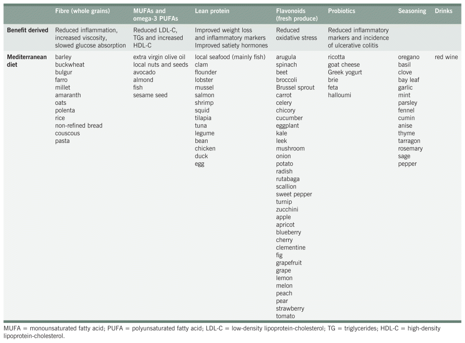 The MD was believed to have been first characterized in the scientific literature in 1958 as part of the first phase of the Seven Countries Study12 observing cardiovascular health. Researchers surveyed middle-aged men from seven countries between 1958 and 1983 with a 5- and 10-year follow-up to assess mortality rates among the participants.12 Although members from various continents were included, the study concluded that dietary patterns from both the Mediterranean and Japan showed lower rates of coronary heart disease and all-cause mortality.12 This initiated decades of research to determine the validity of this study and hypothesize new conclusions surrounding metabolic health. Table 2 demonstrates dietary options in the MD commonly recommended by healthcare practitioners. The MD promotes a mostly plant-based diet abundant in fruits and vegetables, whole grains, proteins such as lean meats and high-omega fatty fish, olive oils, nuts, and seeds. Small amounts of red wine, dairy, sweets, and red meat are acceptable though not main staples of the dietary paradigm.1,5,13 Herbs and spices are used and recommended to reduce the use of sodium to enhance flavour along with certain probiotic foods to support gut microbiota.14 Most research describes the components necessary to designate a diet as Mediterranean, but few discuss the ratio of components. Based on various resources, the MD can be structured into the following macronutrient ratios:5,15–17