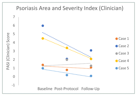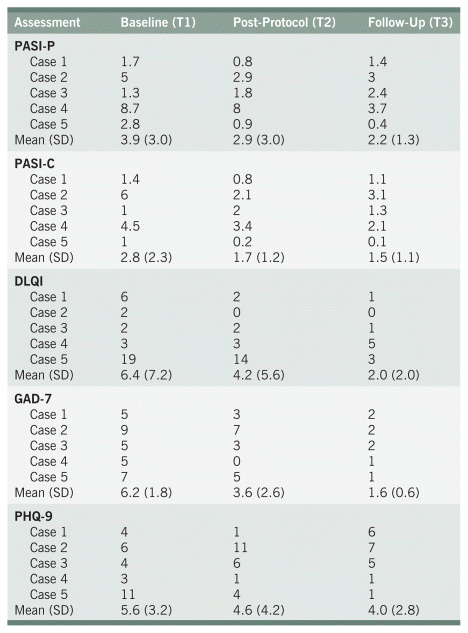 T3: The participant reported that he had an increase in stress over the previous month but was able to maintain 5 to 10 minutes of home practice a week. At T3, PASI-P was 1.4 (mild psoriasis), PASI-C was 1.1 (mild psoriasis), DLQI was 1 (no effect on participant’s life), GAD-7 was 2 (none–minimal anxiety), PHQ-9 was 6 (mild depression).