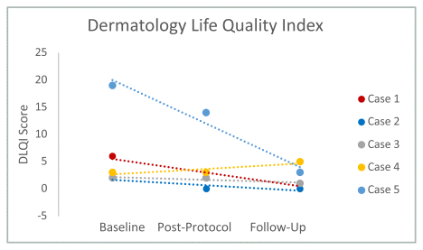 The mean (SD) scores for DLQI at T1, T2, and T3 were 6.4 (±7.2), 4.2 (±5.6) and 2.0 (±2.0), respectively. A one-tailed t-test showed significant difference between T1 and T2 (t-statistic = 2.16, p = 0.05); however, differences between T2 and T3 (p = 0.2) and T1 and T3 (p = 0.1) were not significant. Linear regressions saw a decrease in scores over time for all except case 4 (Figure 3).