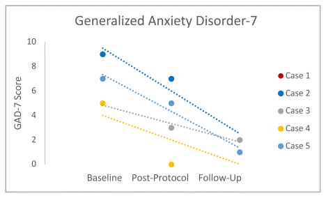 The mean (SD) scores for GAD-7 at T1, T2, and T3 were 6.2 (±1.8), 3.6 (±2.6), and 1.6 (±0.6), respectively. A one-tailed t-test showed a significant difference between T1 and T2 (t-statistic = 4.3, p = 0.006), and T1 and T3 (t-statistic = 5.7, p = 0.002). There was a non-significant difference between T2 and T3 (p = 0.07). Linear regressions by case showed decreasing scores for all cases (Figure 4).