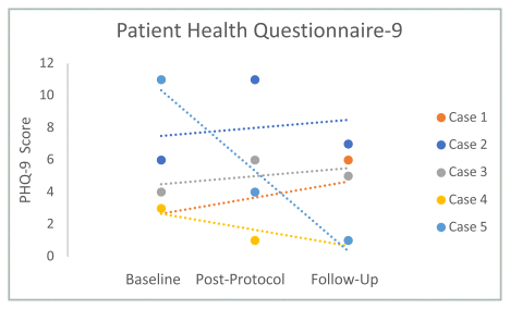 The mean (SD) scores for PHQ-9 at T1, T2, and T3 were 5.6 (±3.2), 4.6 (±4.2), and 4.0 (±2.8), respectively. A one-tailed t-test resulted in non-significant differences for all time points (T1 to T2, p = 0.3; T2 to T3, p = 0.4; T1 to T3, p = 0.3). Linear regressions showed mixed results over time with Cases 1, 2, and 3 positively correlated and Case 4 and 5 negatively correlated (Figure 5).