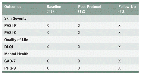 Results: Notable improvements were observed between baseline and post-protocol for PASI-P, DLQI, and GAD-7. A significant change remained for GAD-7 between baseline and follow-up. No major differences were identified for PASI-C and PHQ-9 across any timeframe, and other scales remained consistent between post-protocol and follow-up.