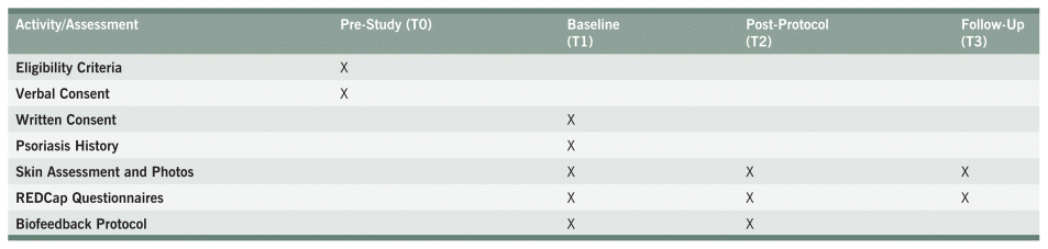 All outcomes measuring SS, QoL, and MH were collected at baseline (T1), post-protocol (T2), and follow-up 1 month after the last biofeedback session (T3) (Table 2). Skin severity was assessed with the Psoriasis Area and Severity Index (PASI),41 QoL was assessed using the Cardiff Dermatology Life Quality Index (DLQI),42 and MH was assessed using the Generalized Anxiety Disorder-7 (GAD-7),43 and Patient Health Questionnaire-9 (PHQ-9).44