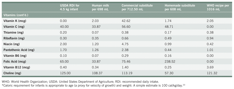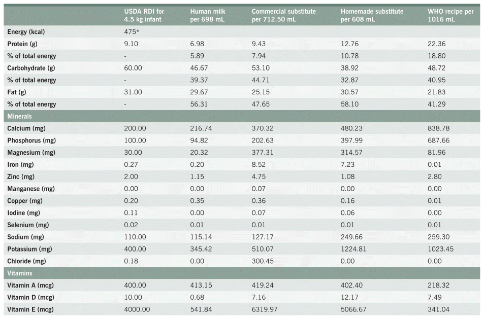 TABLE 2 Nutritional comparison of human milk, commercial formula, homemade substitute, and WHO emergency recipe; USDA RDI standards for a 4.75 kg infant provided as comparison; volumes of milk and substitutes reflect 475 kcal.