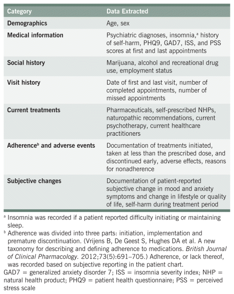 Data extraction was completed using a piloted extraction template by the primary investigator (PI) and three additional data extractors. Extracted data included demographic information, diagnoses, GAD7 and PHQ9 scores, social history, visit history, current treatments, and information pertaining to adherence, adverse events, and subjective changes as described in Table 1. The PHQ9, GAD7, Perceived Stress Scale (PSS), and Insomnia Severity Index (ISI) scores were extracted for first and last available scores only (Table 1).