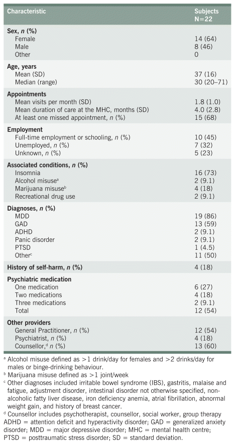 Of the 192 charts reviewed, 22 met the inclusion criteria. Table 2 presents demographic information. The participants were primarily female (64%), with a mean age of 37. About half of the patients reported having a general practitioner (54%), and most (60%) had a therapist or counsellor of any type. About half of participants were taking psychiatric medication during the study (12/22), only 45% were fully employed or studying, and 73% reported insomnia. Four participants had a history of self-harm. On average, participants had visited the Mental Health Shift 1.8 times per month during their course of care, and about two-thirds (68%) had missed at least one appointment during the study period.