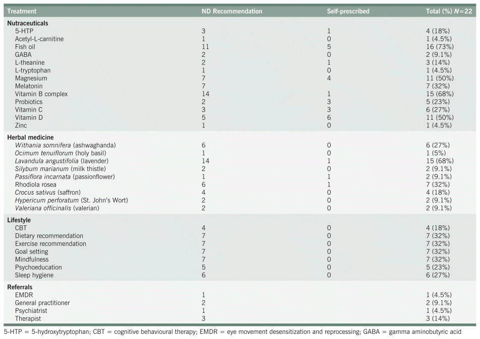 A total of 148 recommendations were made to the 22 participants in this review, including 97 NHPs, 43 lifestyle and education interventions, and 7 referrals. All participants received prescriptions for NHPs, averaging 4.4 products each. The most commonly prescribed NHPs were Lavandula angustifolia (lavender), vitamin B-complex, fish oil, magnesium, melatonin, Rhodiola rosea, and Withania somnifera (ashwaghanda) as seen in Table 3. Many participants (73%, 16/22) were taking at least one NHP at the time of the first visit. Self-prescribed NHPs are also described in Table 3. All herbal medicine was recommended as a concentrated extract form in a tablet or capsule. Most participants (14/22, 64%) also received a lifestyle recommendation involving diet counselling, exercise recommendations, mindfulness activities, goal setting, sleep hygiene and/or psychoeducation.