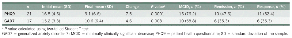 Of the 22 included participants, 21 had an initial PHQ9 score of greater than or equal to 10 and 17 participants had a GAD7 score of greater than or equal to 10. Sixteen participants (73%) had elevated scores (≥ 10) for both initial GAD7 and PHQ9. Table 4 presents the changes in symptom severity from initial to final assessment. For the primary outcome, mean PHQ9 and GAD7 scores decreased by 7.5 (p=0.00001) and 4.6 (p=0.008) points, respectively. A minimally clinically significant decrease (MCID) of at least 5 points was seen in 76.2% of PHQ9 scores and 58.8% of GAD7 scores. Remission and response occurred in about half of the PHQ9 group and one-third of the GAD7 group.