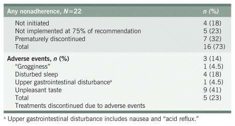 As can be seen in Table 5, treatment nonadherence was documented for at least one recommended treatment in the majority of patient charts (73%, 16/22). Mild adverse events were found in 41% of the patients’ charts, and no serious adverse events were reported. Five treatments were discontinued due to mild adverse events, representing 5.1% of NHPs prescribed.
