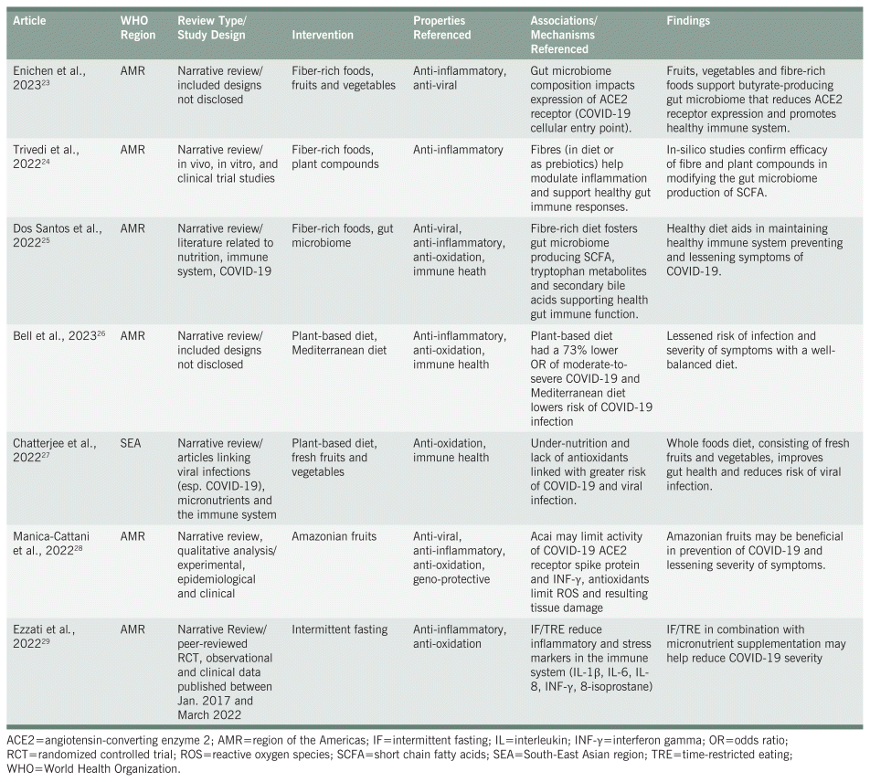 Three narrative reviews synthesized the evidence for the role of a high-fibre diet in maintaining a healthy digestive system and of the gut microbiome as part of a healthy immune response for the prevention and treatment of respiratory diseases, including COVID-19.23–25 Two of these did not clearly outline the types of studies included,23,25 while one stated inclusion of in vivo, in vitro, and clinical studies.24 These reviews discussed the role of fibre in cultivating a gut microbiome that produces short-chain fatty acids (SCFA), such as butyrate, that are anti-inflammatory and anti-viral. One of the reviews discussed the role of butyrate in minimizing angiotensin-converting enzyme 2 (ACE2) receptor expression, limiting the ability of COVID-19 to enter host cells.23 While the ability of a high-fibre diet to reduce the ACE2 receptor expression has been documented, no clinical trials have measured its impact in modifying the progression or symptom severity of COVID-19.