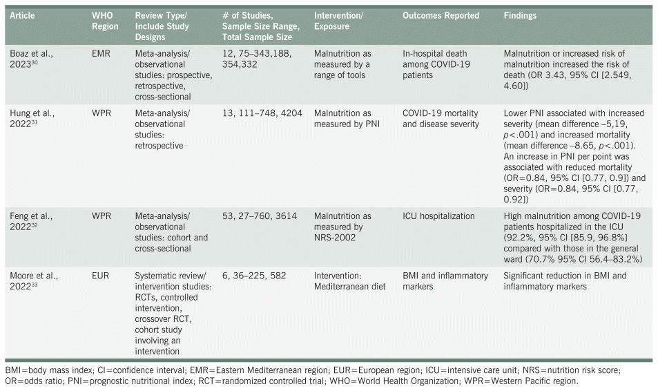 Three systematic reviews highlighted the impact of malnutrition in increasing the risk of COVID-19 hospitalization, disease severity, or mortality.30–32 All three completed a meta-analysis to combine the data identified. All three reviews included studies that used observational design. The first one included prospective, retrospective, and cross-sectional studies,30 while a second included retrospective studies,31 and the third included cohort and cross-sectional studies.32 Each review assessed the quality of the included studies; the tools used included the Quality in Prognostic Studies (QUIPS) tool,31 the Newcastle-Ottawa Scale,32 and the 14-question Quality Assessment Tool for Studies with Diverse Designs (QATSDD).30 The exposure of interest was malnutrition, as measured by the Prognostic Nutritional Index (PNI)31 in one meta-analysis and the Nutrition Risk Score (NRS-2002)32 in a second. The third meta-analysis included studies using a wide range of malnutrition measures.30 The outcomes of the observational studies included COVID-19 prevalence, disease severity, intensive care unit (ICU) hospitalization, and COVID-19 mortality. The number of studies included in each review was 12,30 13,31 and 5332 with a total sample size of n = 354,332, n = 4204, and n = 3614, respectively.