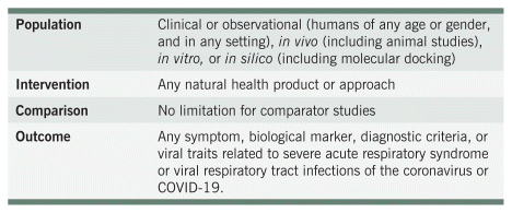 Throughout the live review, monthly literature searches were undertaken following the Cochrane Guidelines for a Living Systematic Review. Both PubMed and Google Scholar databases were included, with search terms including “natur*,” “herb*,” “nutraceutical,” “botanical,” “medicinal plant,” “Ayurvedic,” “Chinese medicine,” “herbal patent formula,” combined with “prevention,” “prophylaxis,” “deficiency,” “treatment,” “management,” and “*COVID*,” “Coronavirus,” “SARS-CoV-2.” Individual plant names and compounds cited in the literature were also searched. Articles were grouped based on the type of review—systematic, narrative, meta-analysis, and others.