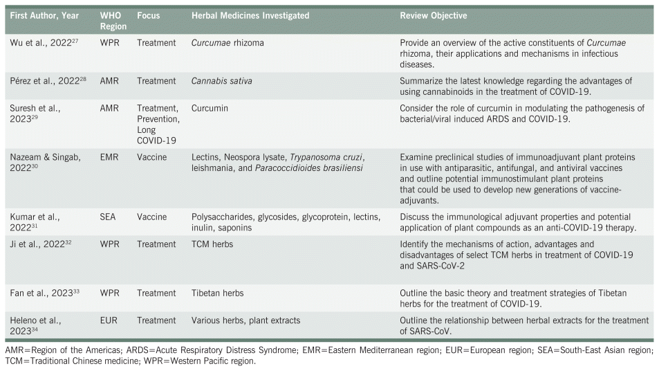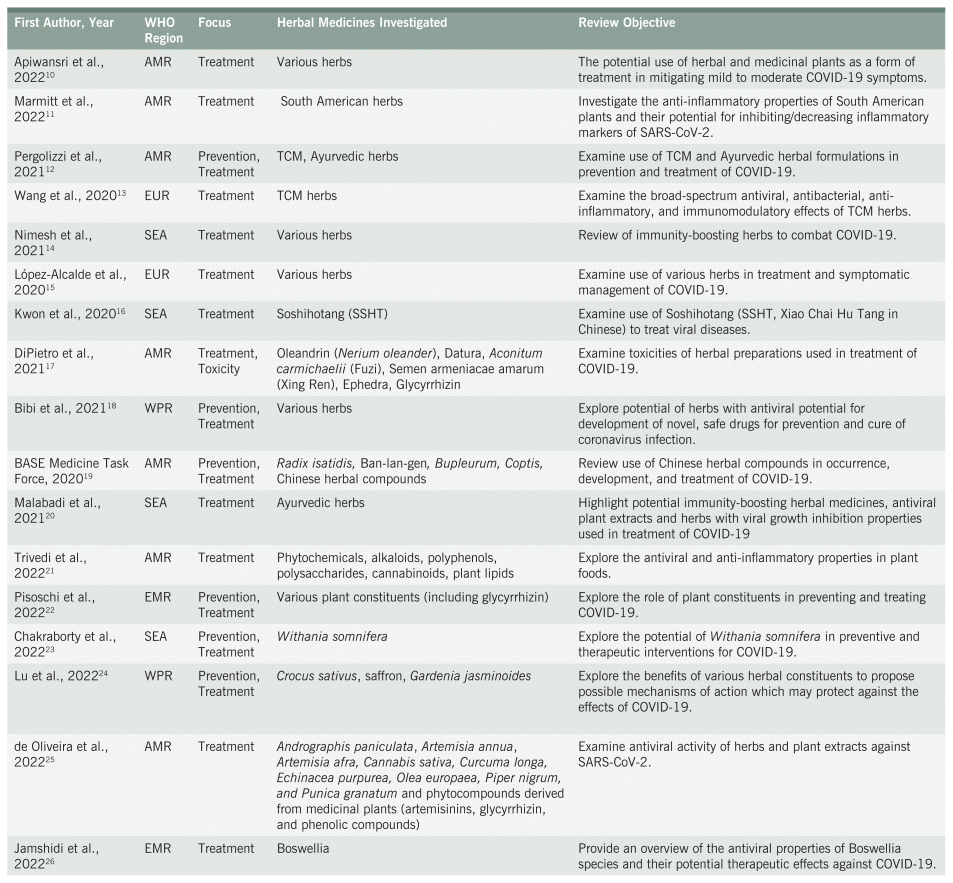 Although umbrella reviews do not typically include narrative reviews, these potentially provide broader information useful for considering potential clinical implications, such as for diagnosis and treatment.9 Twenty-five narrative reviews10–34 were included in this project (Table 2). Most (n = 16)10,11,13–17,20,21,25–28,32,33,34 focussed on treatment of COVID-19 while a further six (6)12,18,19,22–24 papers examined both prevention and treatment and one (1)29 examined prevention, treatment, and post-COVID syndrome. Additionally, two (2)30,31 papers examined the use of herbal medicine as an adjunct for COVID vaccination. WHO world regions represented included the Americas (n = 9), South-East Asia (n = 5), Western Pacific (n = 5), Eastern Mediterranean (n = 3) and European region (n = 3). A broad range of herbs, used in Ayurvedic, Traditional Chinese, Thai, Tibetan, and Western naturopathic systems of medicine used in the prevention and treatment of COVID-19 and post-COVID syndrome were examined.