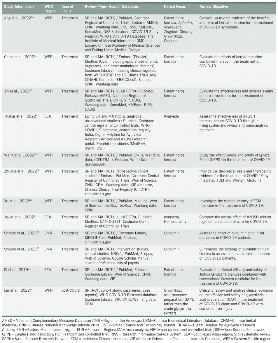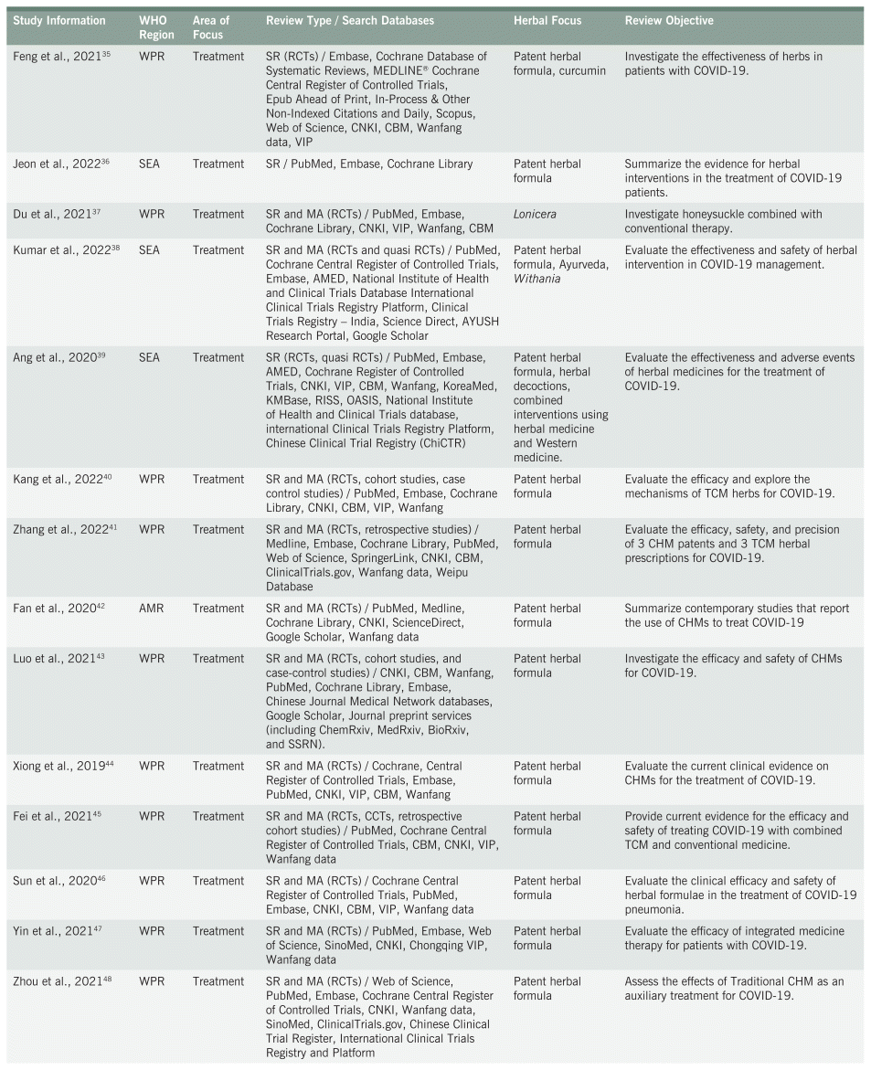 In total, 32 systematic reviews considered the role of patent herbal formulas in the treatment of COVID-19.35,36,38–57,60–62,64–66,68–70,74 Herbal formulations studied included decoctions, granules, pills, patent formulas, or injections (see Table S3 in the supplemental material). All papers focused on treatment, with none reporting on prevention or management of post-COVID syndrome.