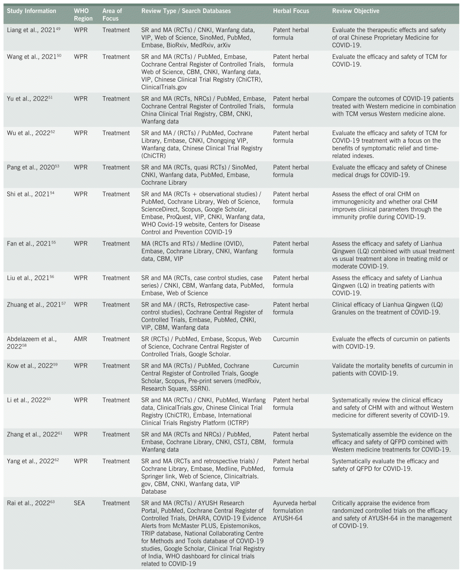After the inclusion/exclusion screening phase, 51 systematic reviews were included for data extraction. During data extraction, a further 10 systematic reviews were excluded. In total, 41 systematic reviews35–75 examining the contribution of herbal medicine were included in this umbrella review (Tables 3 and 4). The focus of the systematic reviews was treatment of COVID-19 (n = 40). Most of the research originated from the Western Pacific (n = 30). As with the narrative reviews, a variety of herbal interventions were considered in the systematic reviews. Most (n = 32) examined patent herbal formulas either alone or in conjunction with other interventions. All systematic reviews identified specific tools for assessing risk of bias (RoB). Eleven studies35,45,46–48,55,61–63,67,75 reported that studies had moderate to high reported RoB. Factors reported as contributing to high RoB included lack of information regarding blinding or randomization, problems with measurement of outcomes and selective reporting, selection bias, and small sample size.