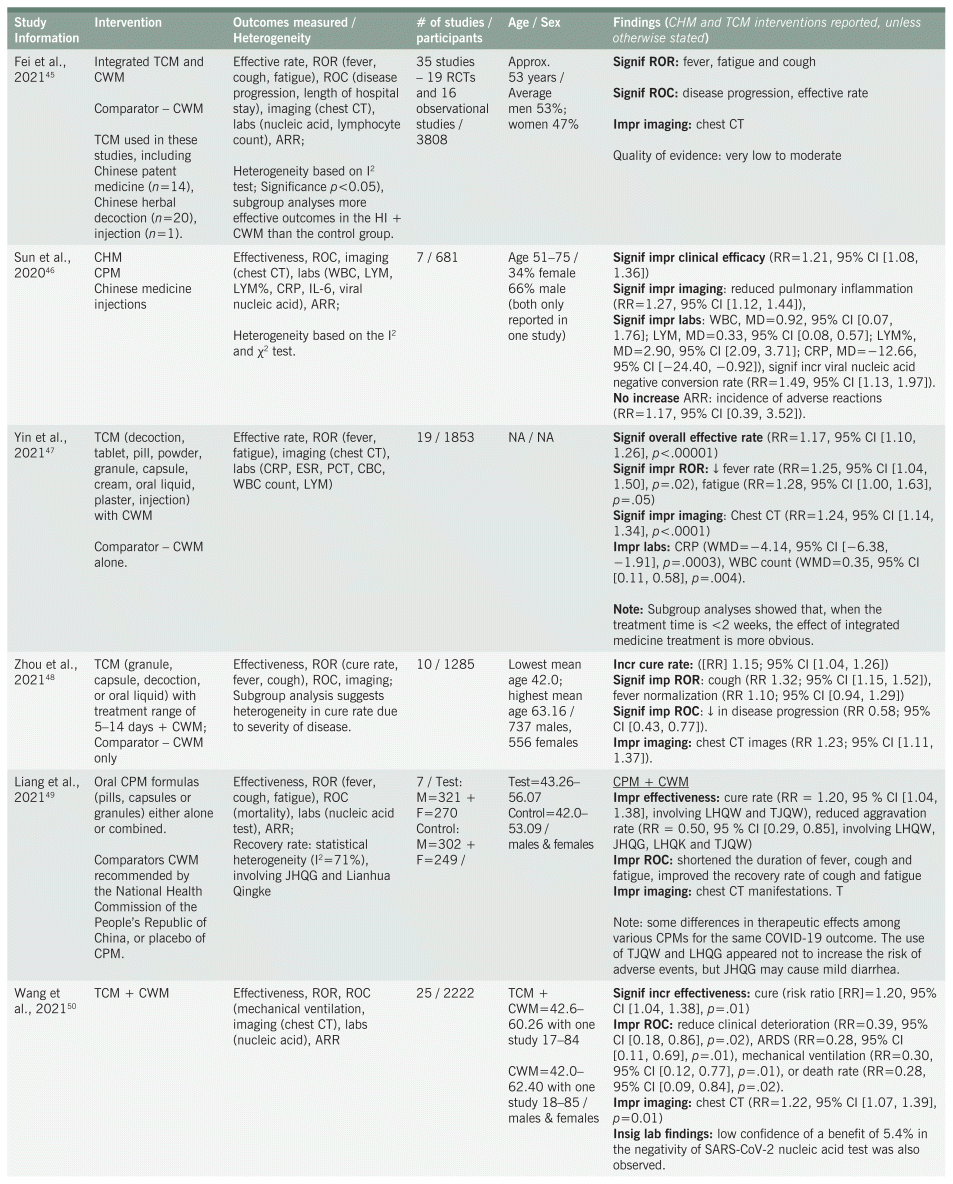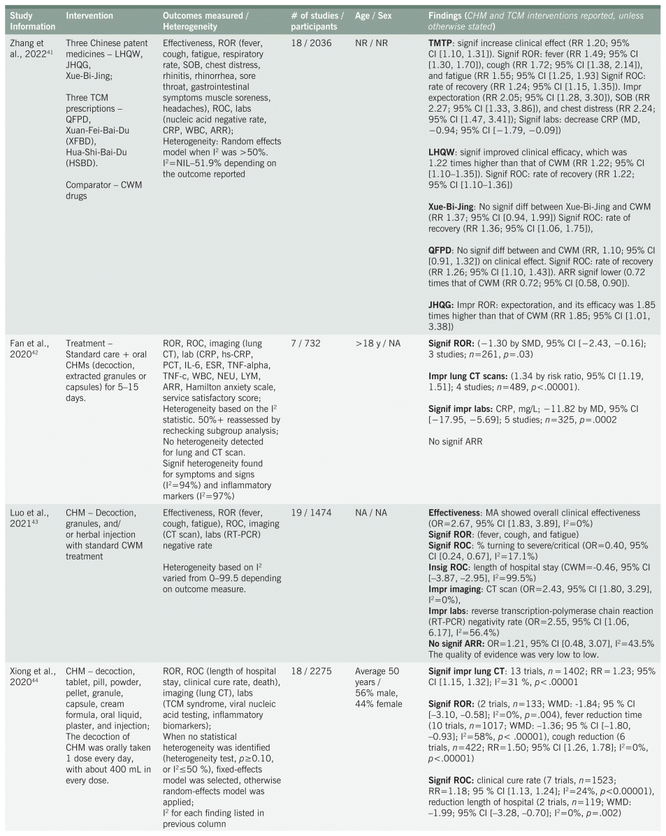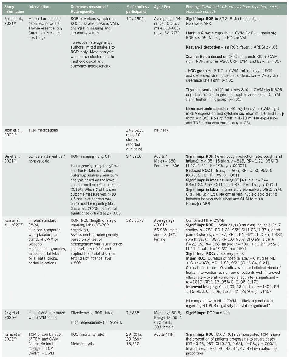 A significant finding, particularly among the reviews of CHM interventions, was the added benefit of herbal treatment to patient outcomes when botanicals are combined with standard care or Western medicine. Objective laboratory measures showed statistical improvements within complete blood counts (CBC) (white blood cells [WBS], lymphocytes), CRP, and other measures of inflammation. Relief and reduction of COVID-19 symptoms and the rate of conversion, especially in relation to the duration of stay in hospital and viral clearance, was also evidenced. Combining herbal medicine with standard treatment thus may reduce overall cost of treatment through better patient response to treatment and improvements in recovery from illness.