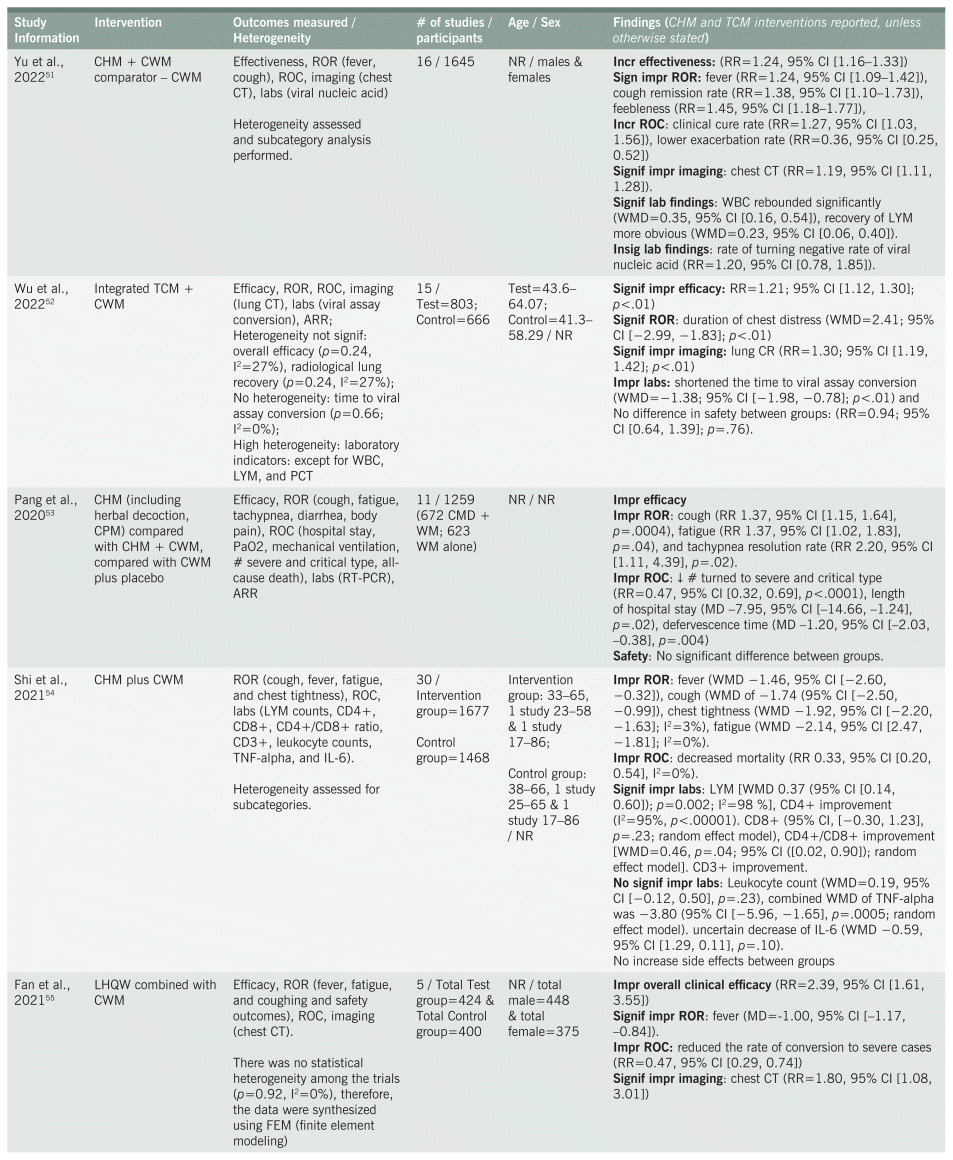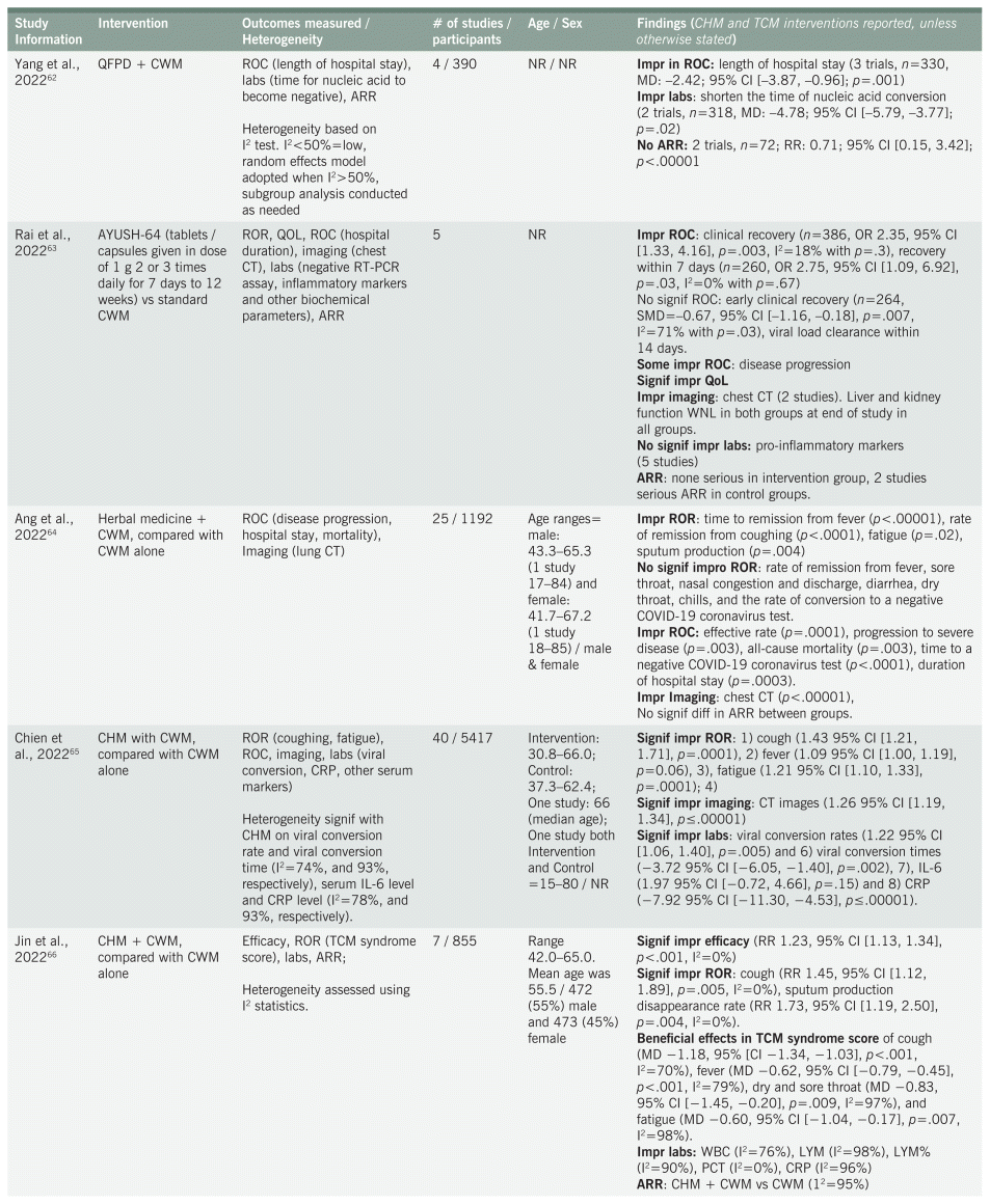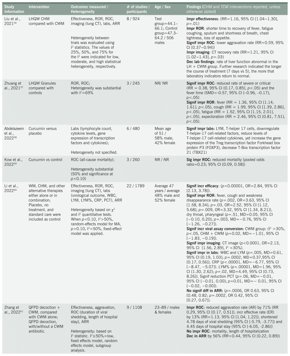 Twenty-five35,37–39,41–45,47,48,51–55,57,60,65,66,68,69,70,72,74 of the systematic reviews found significant improvement in ROR, based on one or more of the symptoms associated with COVID-19, primarily fever, cough, fatigue. Other ROR that improved included chest pain, sore throat, and expectoration. Reduction in ROC, especially as it related to duration of stay in the hospital, was reported as significant in 19 of the systematic reviews37,38,40,41,43–45,48–50,51,53,54,56,57,59,68,69,70 and indicated as insignificant in four reviews.38,43,61,67