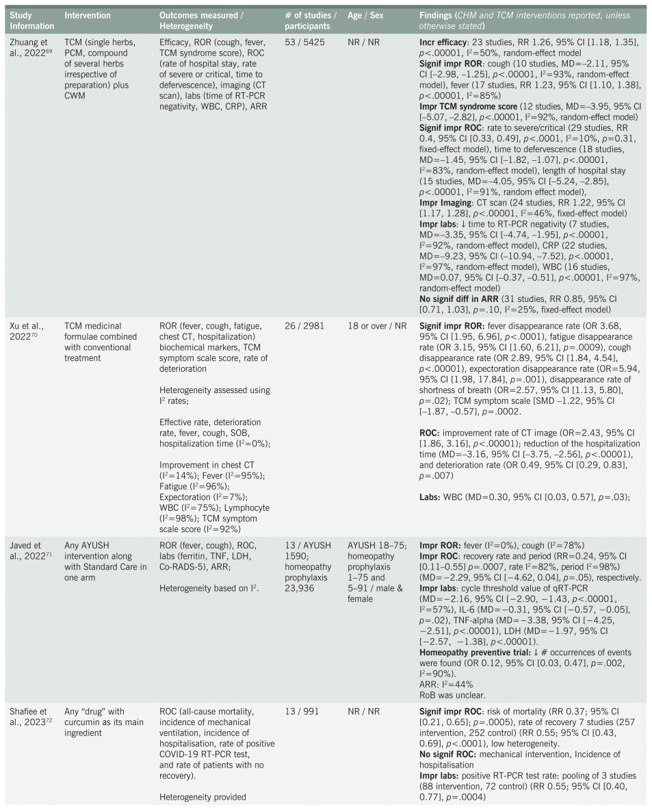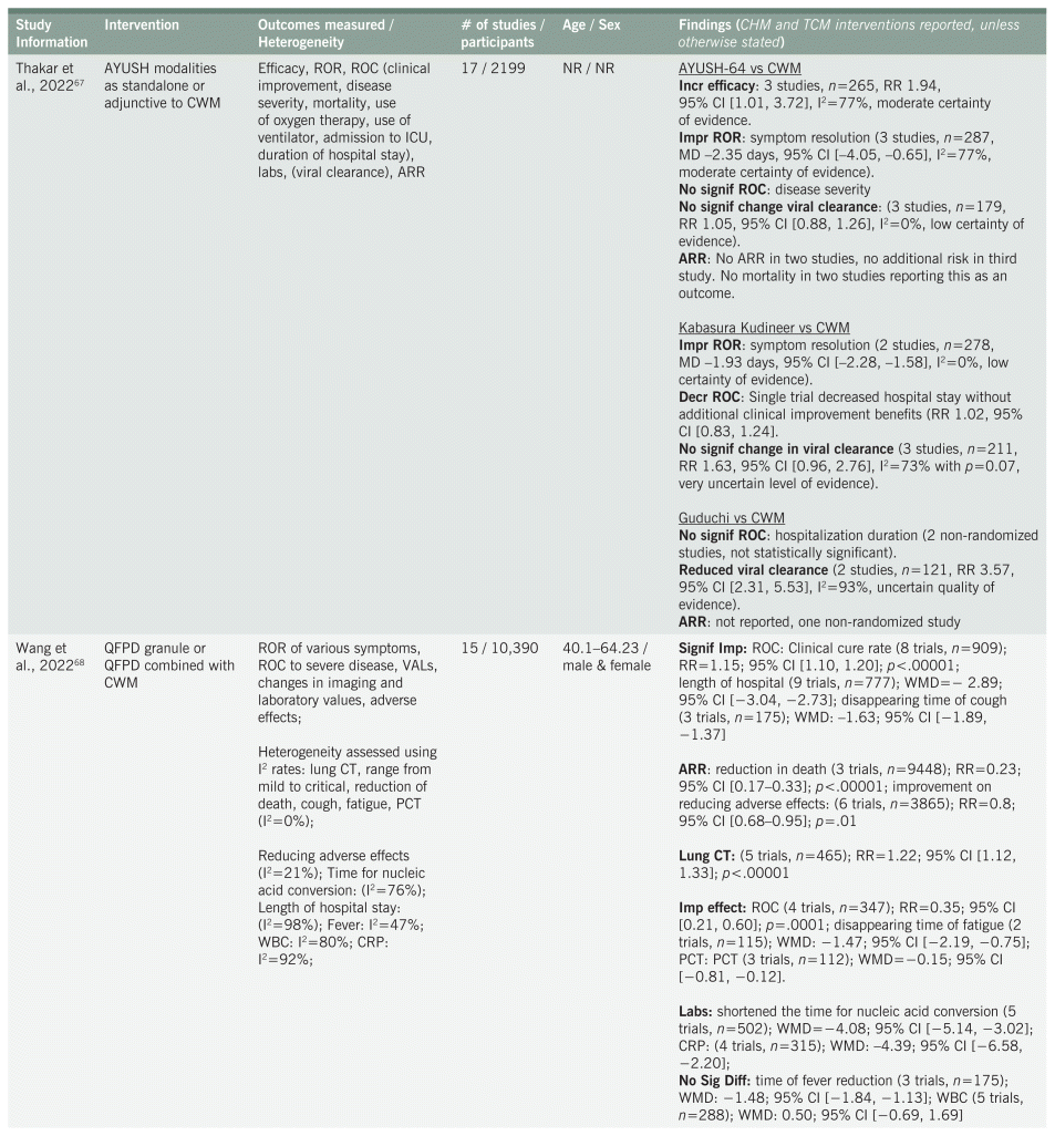 Four systematic reviews reported on the effects of Ayurvedic medicine in the treatment of COVID-19.38,63,67,71 The types of studies included were RCTs and quasi-RCTs. Herbal interventions included granules, decoctions, tablets, nasal drops, and injections. Studies included in the systematic reviews examined Ayurvedic herbal medicine as adjunct to standard care,38,63,67,71 as a standalone treatment,38,67 or compared with placebo or placebo plus Western medicine.38