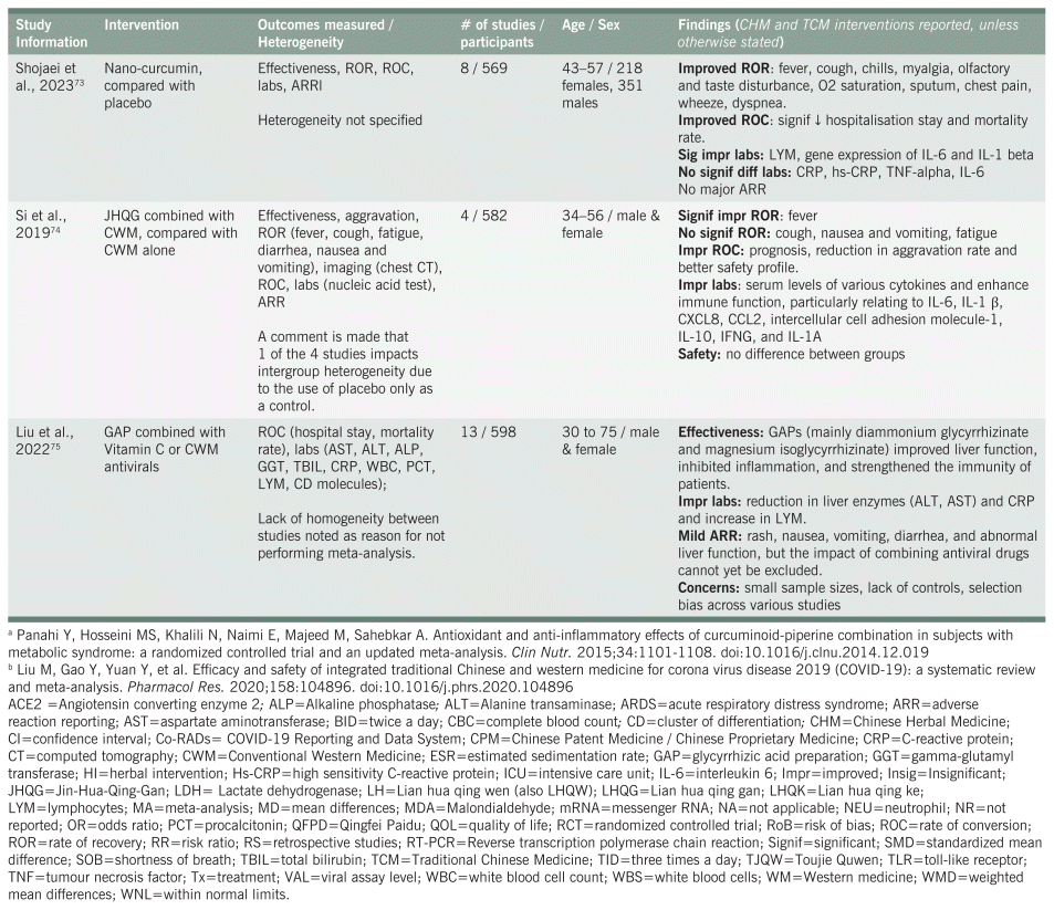 One systematic review75 considered the role of glycyrrhizic acid preparation (GAP) in the treatment of COVID-19 alone and COVID-19 with comorbid liver injury, particularly in relation to its efficacy and safety.75 The study reported that GAP contributed to a reduction in liver enzymes and CRP while improving liver function, inhibiting inflammation, and strengthening immunity. Some mild adverse reactions were reported although the impact of co-administration with antiviral drugs was not investigated.