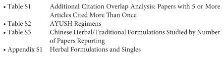 The degree of citation overlap across the 41 systematic reviews included in this paper is 3.8% (268 individual references, in 687 unique instances across 41 total systematic reviews). Overall, this would be considered a slight overlap. Twenty-seven35,37–55,60,61,64,65,68–70 out of the 41 systematic reviews included in this paper (67.5%) contained 5 or more articles cited more than once across all included reviews (see Table S1 in the supplemental material). All these reviews studied TCM, including patent TCM herbal formulas. This represents 27 out of the 32 total reviews that studied TCM herbal formulas. One review38 also examined herbs used in the Ayurvedic system of medicine. We determined that the impact any occurrence of overlap would have on our review findings was high. This means that findings related to TCM should be interpreted cautiously to consider the possible duplication of findings reported across the reviews citing the same papers.