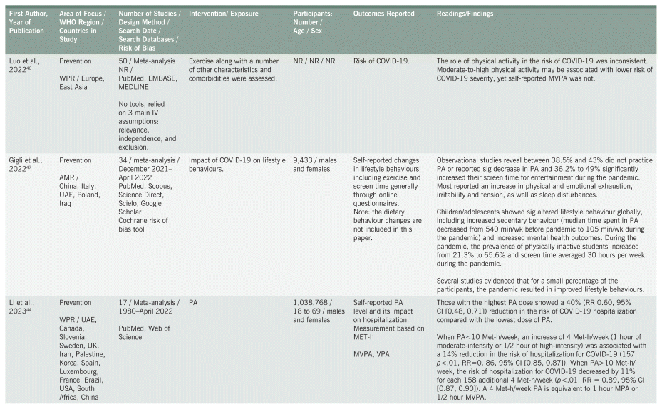 Of the 41 initially identified systematic reviews in this section, 5 papers were included in the final write-up44–48 (Table 1). The included systematic reviews were conducted in the following WHO regions: the Western Pacific region (WPR) (n = 3), region of the Americas (AMR) (n = 1), and Eastern Mediterranean region (EMR) (n = 1). Movement and exercise were explored as they relate to being a comorbidity for COVID-19,46 the impact of COVID-19 public health measures on movement and exercise,47 physical activity (PA) as a prevention for COVID-19,44 the impact of pulmonary respiratory muscle exercises (PRME) as an adjunct treatment for COVID-19,45 and the value of respiratory muscle training (RMT) in long COVID.48