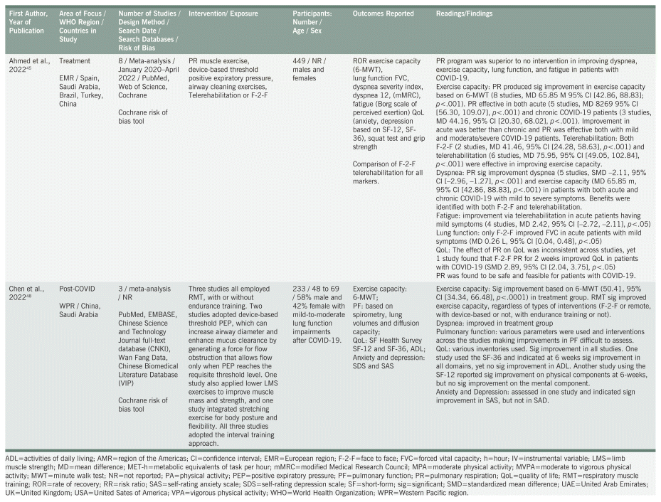 Chen et al. (2022) explored pulmonary rehabilitation (PR) and impaired respiratory function associated with COVID-19 and provided evidence of improved exercise capacity when measuring a 6-minute walk test among 233 patients with long COVID.48