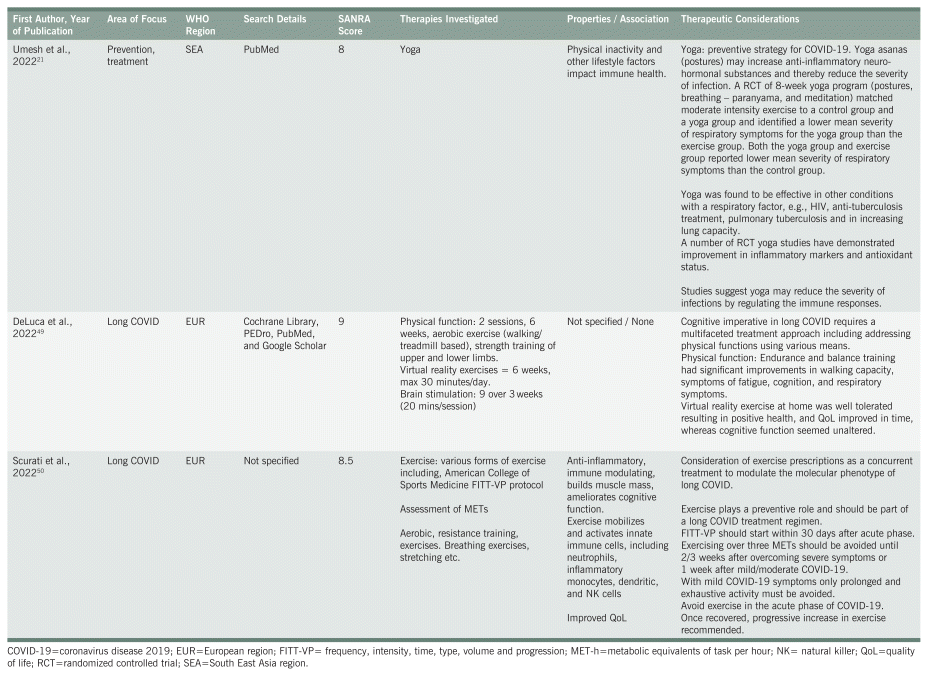 Narrative reviews were included in this umbrella review to provide a broader perspective on the therapeutic considerations and to complement the details of the systematic reviews (Table 2). Of the nine narrative reviews initially included, eight remained for data extraction and three papers were included in the final write-up.21,49,50 The three papers in the narrative reviews included the following WHO regions: European region (EUR) (n = 2) and South-East Asian region (SEAR) (n = 1). One of the narrative reviews focused on the impact of yoga asanas (postures) and yogic breathing (pranayama) on prevention and treatment of COVID-19. The other two narrative reviews discussed various forms of exercise for the treatment of long COVID.