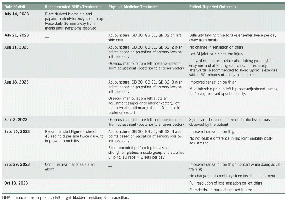 On August 11, 2023, after about 1 month of taking the proteolytic enzymes twice daily and one acupuncture session, she reported indigestion and acid reflux after taking the enzymes immediately before a spin cycle class. She was advised to continue the supplement and to avoid doing vigorous exercise within 30 minutes of taking the capsule. Her adverse reaction completely resolved and did not reoccur. Gastrointestinal upset is a known side effect of proteolytic enzymes if taken on an empty stomach and followed by exercise.8 The patient was adherent to taking this supplement for the duration of her treatment, as assessed by clinical inquiry each visit.