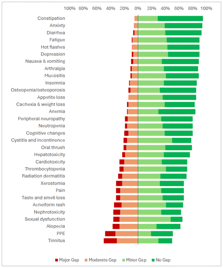 Regarding knowledge gaps related to managing cancer and treatment-related symptoms and side effects (Figure 2), the greatest knowledge gaps were reported for tinnitus, palmar plantar erythrodysesthesia, and sexual dysfunction. Of the 32 symptom prompts, NDs reported a minor gap or less on average for 23 items (72%). None of the respondents reported a major gap for managing appetite loss, hot flashes, anxiety or constipation.