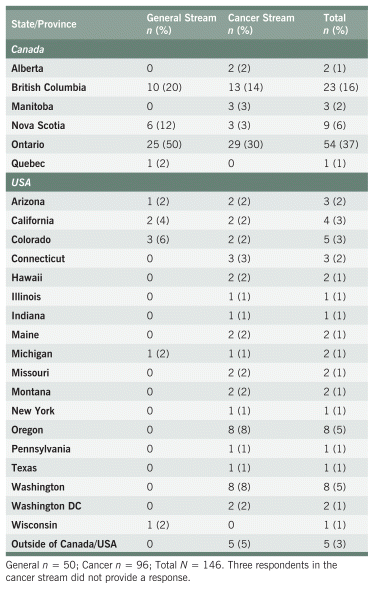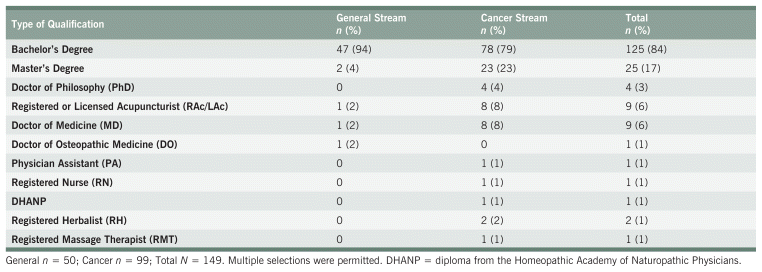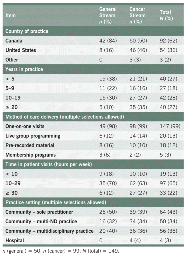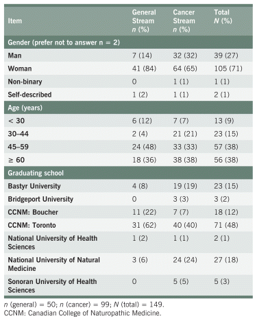 Of the 149 respondents, 105 (71%) identified as women and 113 (76%) were 45 years of age or older. Ninety-nine respondents (66%) were in the cancer stream, and 50 (34%) were in the general stream. Of the 39 respondents who identified as men, 31 (79%) provided supportive cancer care. A greater percentage of NDs from the cancer stream had higher levels of education (i.e., a master’s or PhD) compared with the general stream (29% vs. 4%, respectively). The majority of respondents (60%) had graduated from CCNM, and 48% had attended the Toronto campus. A full list of respondent demographics is presented in Table 1, and additional academic and professional qualifications are provided in Appendix A, Table S1.
