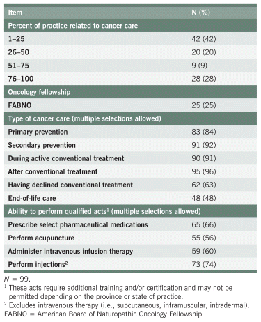 Methods: A 40-item online survey was distributed to NDs through naturopathic associations, social media, and informal networking. Questions varied based on whether respondents provided cancer care (“cancer stream”) or not (“general stream”). The survey ran from September 2023 to March 2024. Data analysis included frequency distributions and descriptive statistics.
