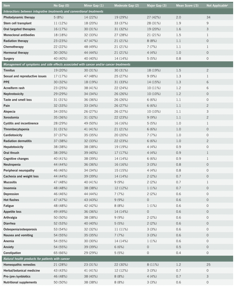 In contrast, NDs reported the highest knowledge gaps for EGCG and curcumin infusions, photodynamic therapy, ozone therapy, and low-level laser therapy. This is not surprising, as responses indicate these therapies are recommended by NDs least often. Other possible reasons for high knowledge gaps with these therapies and their low frequency of use may include a lack of access to required medical supplies, a limited scope of practice (especially since 37% of respondents were from Ontario, where photodynamic therapy and ozone therapy are outside the scope of the profession), a paucity of research on the use of these therapies in cancer care, and/or the fact that they are not a core component of naturopathic cancer courses.28,29 In total, there were 10 items (13%) where a moderate or major gap was reported by more than 50% of respondents.