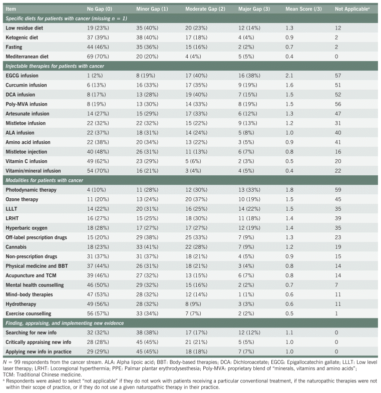 Results: Among 149 eligible responses, 62% practiced in Canada, 36% in the United States, and 2% elsewhere. The cancer stream (n = 99) primarily worked in community settings, offered hybrid care, and did not exclusively treat cancer patients. The largest knowledge gaps were related to intravenous (IV) green tea extract and curcumin, photodynamic and ozone therapy, managing tinnitus, and interactions between naturopathic interventions and stem cell transplants and photodynamic therapy. Time constraints were the main barrier to addressing knowledge gaps. The smallest gaps were reported for exercise counselling, the Mediterranean diet, IV vitamin C, vitamin/mineral infusions, and managing constipation, anxiety, diarrhea, fatigue, hot flashes, and depression. In total, 97% supported the development of clinical resources, with no format preference. In the general stream, 58% indicated that additional training would increase their likelihood of offering cancer care.