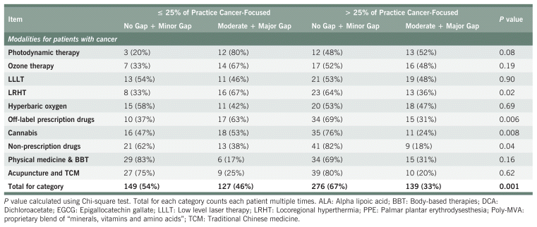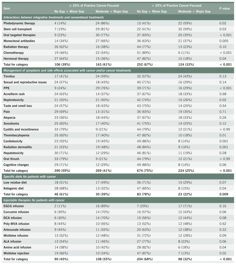 Across all categories, there were 44 items for which a moderate or major knowledge gap was reported by ≥ 20% of respondents. For 38 of these items (86%), NDs for whom supportive cancer care accounted for only ≤ 25% of their clinical practice reported moderate or major knowledge gaps more often than those whose practice was > 25% cancer-focused. Statistical significance (p < 0.05) was reached for 16 of these items (36%). A complete table is present in Appendix A, Table S9.