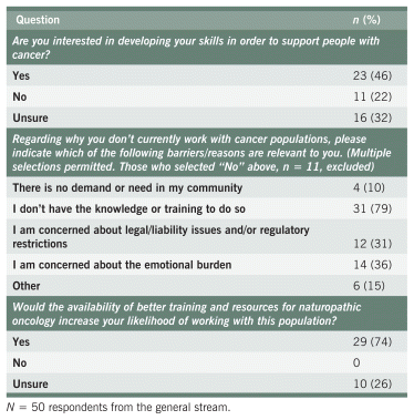 Of the respondents in the general stream, 23 (46%) indicated they were interested in developing skills to support people with cancer, 11 (22%) were not interested, and 16 (32%) were unsure. Excluding those who were not interested, 31 (79%) respondents reported they don’t work with cancer populations because of a lack of knowledge or training, and 29 (74%) indicated that the availability of better training and resources would increase their likelihood of providing naturopathic cancer support. More information regarding the interest of the general stream in providing cancer care is presented in Appendix A, Table S12.