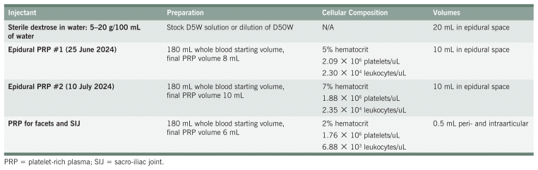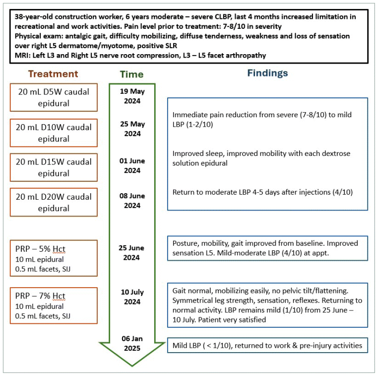 After the fourth dextrose solution injection, the patient wished to step up to epidural PRP combined with PRP injections into the facet joints that were most likely contributing to his symptoms based on imaging (L4/L5 and L3/L4 facets). Two weeks after the last dextrose solution epidural (June 25, 2024), 10 mL of 5% hematocrit PRP was injected into the epidural space and 0.5 mL of 2% hematocrit PRP was injected into the facet joints under ultrasound guidance. Additional 2% hematocrit PRP (0.5 mL each site) was injected into the left base of the sacro-iliac joint and the left gluteus maximus insertion point. Platelet-poor plasma was injected into multiple trigger points (0.5 mL each) on the left side. The patient reported that 4 days after the first PRP injections his back pain had almost completely resolved, and he regained sensation in his right great toe—he had not had sensation in that toe for the last 6 years. His ambulation and mobility had greatly improved, and he was able to engage in bodyweight strength training with minimal discomfort. The patient requested an additional PRP epidural on July 10, even though his CLBP symptoms had not returned since the last epidural. 10 mL of 7% hematocrit PRP was injected caudally into the epidural space and the same facet and sacro-iliac joint sites as his first PRP treatment. Since the last PRP treatment the patient has not needed any further injection therapy. As of January 2025, he has returned to full duties at work, he feels no limitations in activity, and he ranks his back pain at less than 1/10 (more than 6 months later). Table 1 outlines additional details of the injectant composition and preparation for the dextrose solutions and PRP.