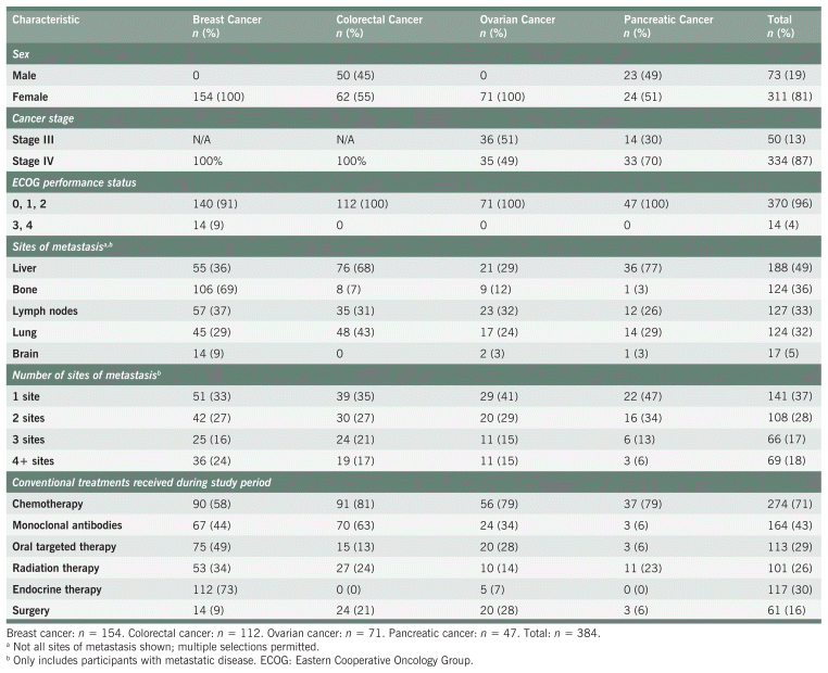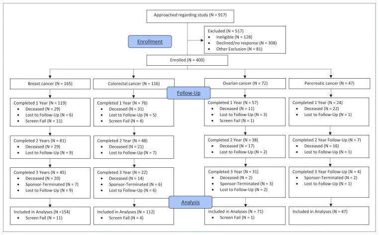 In total, 400 patients were enrolled. Sixteen were deemed screen failures (i.e., ineligible after being enrolled), leaving 384 participants included in the analyses. One hundred fifty-four had breast cancer, 112 had colorectal cancer, 71 had ovarian cancer, and 47 had pancreatic cancer. Figure 1 shows participant flow throughout the study.