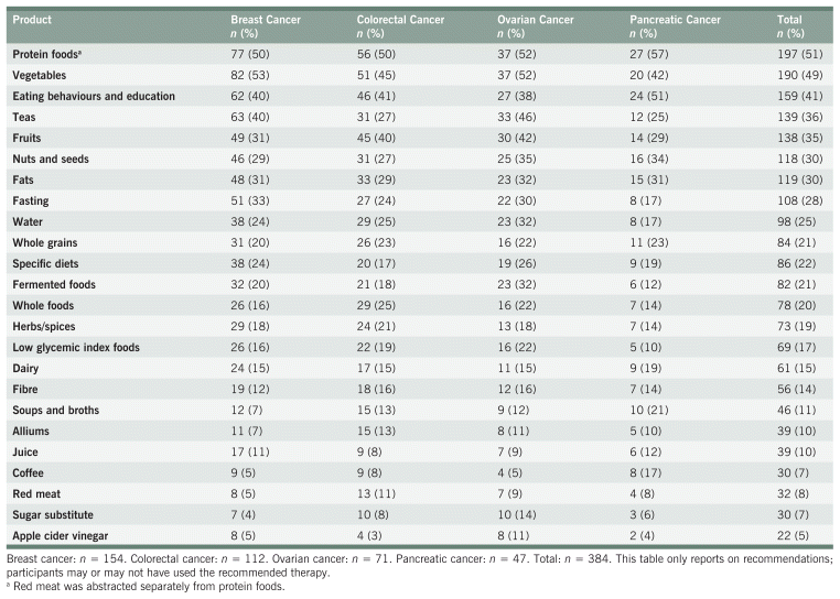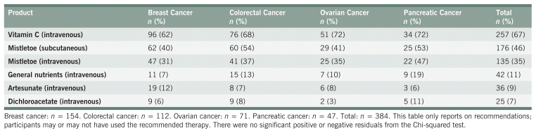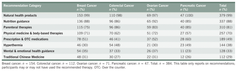 Methods: Patients with advanced breast, colorectal, ovarian, or pancreatic cancer were recruited from 12 North American naturopathic clinics and followed for 2 to 3 years. Therapeutic recommendations were abstracted from clinic records.