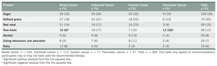 Tables 5 and 6 show the most common nutrition encouragements and discouragements, respectively. Dietary encouragements were made much more often than discouragements (83% vs. 17% of all dietary recommendations, respectively). This trend was consistent across each cancer type. The top ten most encouraged dietary items were: protein-rich foods (e.g., poultry, fish, legumes), vegetables, eating behaviour changes and nutrition education, fruits, tea, nuts and seeds, fats, fasting (e.g., before chemotherapy, intermittent fasting), water, and whole grains. Protein-rich foods was the only recommendation made to at least 50% of participants across all cancer types. Tea recommendations were primarily green tea (63% of all tea recommendations) and herbal teas (36%) The most common eating behaviour recommendations were increasing caloric intake (23% of all recommendations) and eating small frequent meals (20%). The only items that were mainly discouraged were sugar, refined grains, red meat, raw foods, and alcohol. One exception is in participants with pancreatic cancer, where red meat was encouraged slightly more often than it was discouraged (8% versus 6%, respectively). Teas (encouragement) and raw foods (discouragement) were the only items with significant non-uniformity across cancer types. Raw foods were discouraged more often than expected in participants with pancreatic cancer and less often than expected in participants with breast cancer.