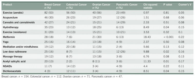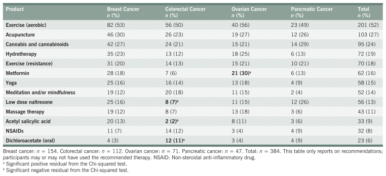 Exercise was recommended to 57% of participants, with aerobic exercise (52%) being far more common than resistance training (18%). Cannabis and cannabinoids were recommended to 24% of participants. Hydrotherapy and massage therapy were recommended to 19% and 11% of participants, respectively. Metformin (16%) and low-dose naltrexone (15%) were the most recommended prescription medications. Yoga and meditation/mindfulness were the most recommended activities to support mental health, each made to approximately 15% of participants. Acupuncture was recommended to 27% of participants. All prescription and OTC medications (except non-steroidal anti-inflammatory drugs), as well as hydrotherapy recommendations, were significantly different between cancer types per the Chi-squared test; however, associations were weak. Table 8 fully describes these recommendations.