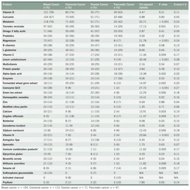 Although there were no strong associations between any treatments and cancer type, more than 50% of the NHPs analyzed showed statistically significant non-uniformity between cancer types. This suggests there may be some specificity in the care provided by NDs in this domain. For some of the differences found in NHP recommendations, there are reasonable justifications. Participants with pancreatic cancer had a smaller overall number of NHP recommendations compared with other cancer types and the most significant negative residuals. This may be due to the higher incidence of digestive issues, cachexia, and sarcopenia,26 which could result in NDs recommending fewer oral supplements to avoid worsening digestion or decreasing food intake. Linum usitatissimum (flaxseed) recommendations were higher in breast cancer (and to a lesser degree ovarian cancer), likely due to the lignan content, which impacts estrogen metabolism and signaling.27–31 Digestive enzymes were more frequently recommended in pancreatic cancer, which is almost certainly due to the high incidence of exocrine pancreatic insufficiency and digestive upset in this population.32 Calcium and vitamin K were more common in those with breast cancer, which could be due to a higher rate of osteoporosis and fractures in this cohort.33 However, for other discrepancies, the reasons are not clear, and in most cases the differences may not be clinically meaningful.